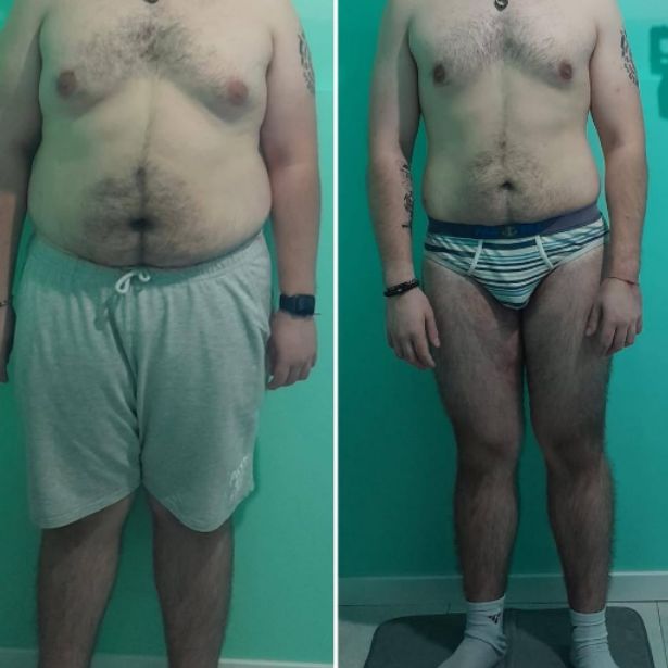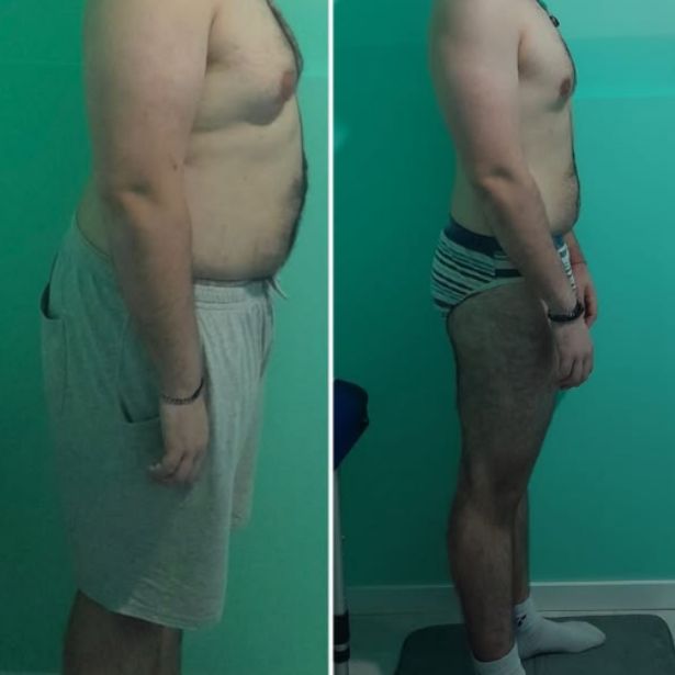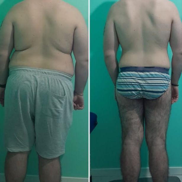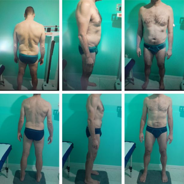 Nelle foto sopra il soggetto presentava un peso prossimo ai 96 kg con una massa grassa vicina al 23%. Buona massa muscolare dovuta alla sua attività fisica comunque sempre costante negli anni.